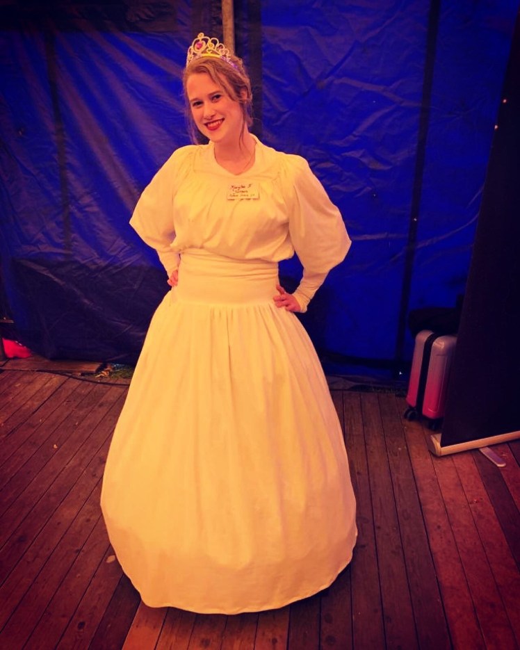 Als je naar zoiets als Winter Castlefest gaat, wil je uiteraard wel een mooi kostuum. Cathinca had me echter gewaarschuwd dat het koud zou worden en dat ik me warm aan moest kleden. Reden voor mij om warme stof te bestellen om een nieuwe rok te maken. Ik besloot om aan te sluiten bij mijn boeken Wonderland en het verhaal Bevroren uit de bundel Er was eens. Op de blauwe voorkant van Wonderland staat namelijk een koninklijke vrouw in het wit en Bevroren is gebaseerd op Frozen en De Sneeuwkoningin. Ik ging dus als Sneeuwkoningin. De rok ging redelijk makkelijk en was een of twee weken van tevoren af. Maar op vrijdag 22 november besloot ik dat ik ook een warme mantel moest hebben. Bij de Action kocht ik een witte flanellen deken en thuis vond ik nog een grijze. Vervolgens heb ik mijn Outlandercape nagemaakt. Een project dat we me tot 1:00 uur die avond bezighield! Maar goed, hij was wel draagbaar de volgende dag 😏