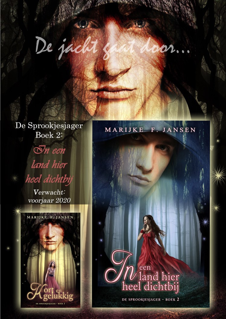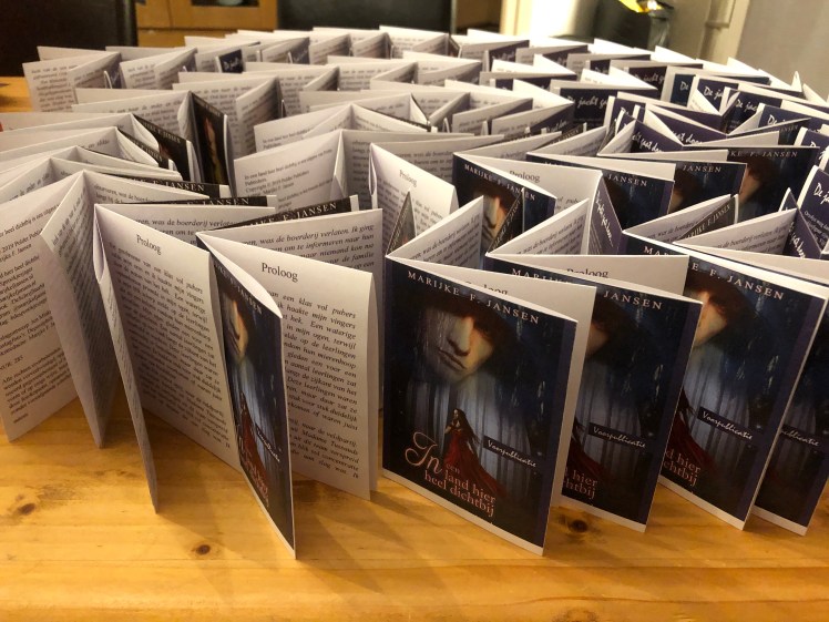 Naast kleding, moesten er natuurlijk ook boeken en promotiemateriaal mee. In de maand november ben ik heel druk geweest met het vervolg op Kort en gelukkig en ineens bedacht ik dat het een handig idee was om alvast aan te kondigen dat het vervolg eraan zit te komen! Ik vroeg Jen Minkman of ze met spoed de eerste versie van de cover van deel 2 wilde ontwerpen en maakte daarmee een aankondigingsposter en een hele stapel voorpublicaties met de proloog van In een land hier heel dichtbij.