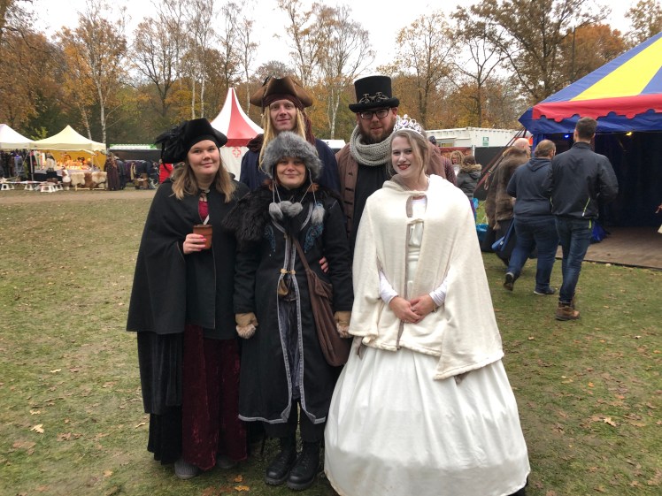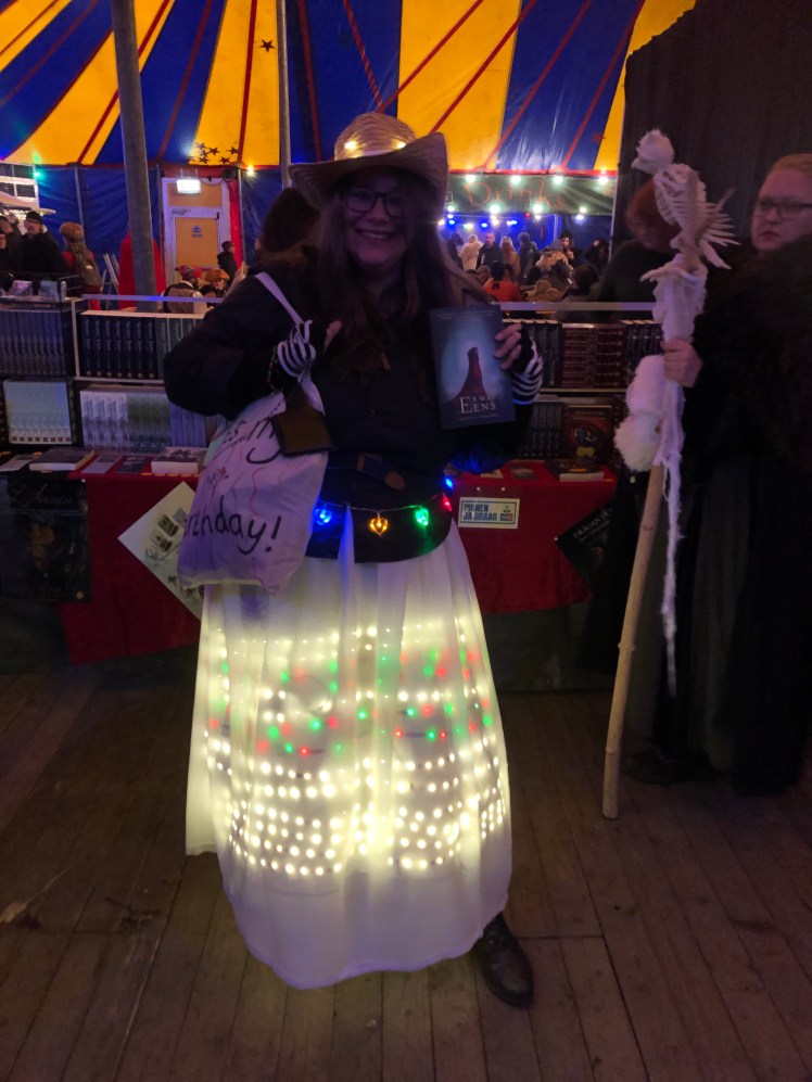 Ik heb genoten van het werk in de stand. Je komt met zoveel leuke mensen in gesprek! Soms gaat het over boeken, andere keren over het festival, kostuums, het weer of hele verrassende andere onderwerpen. Het mooiste kostuum vond ik Roodkapje, haar Grote boze Wolf en hun dochtertje Wolf. Ik moest dan ook even vragen of ze met Er was eens op de foto wilden! Ook leuk was het gesprek met de in verlichte jurk gestoken Irene die boeken kocht en die jarig bleek te zijn!