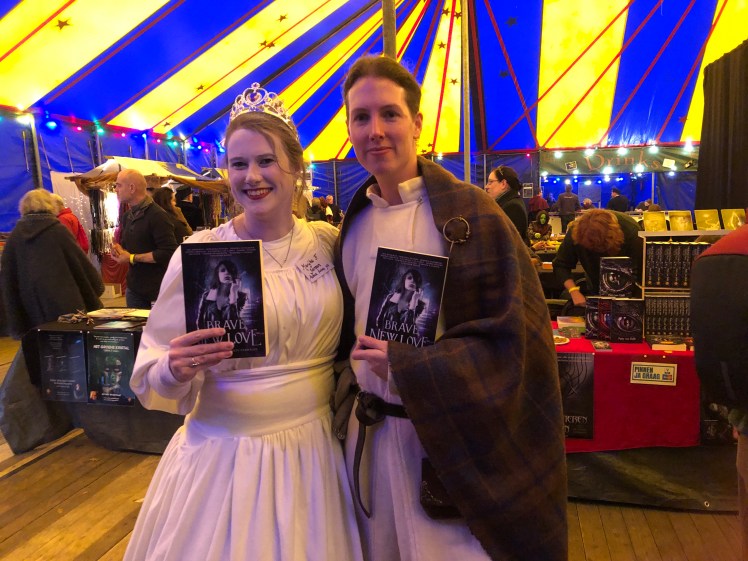 Onze stand bleek zich te bevinden in The Great Hall, een grote tent met een muziekpodium, bar, overdekt terras, gezellige standjes en, heel belangrijk, een heater! Mijn zorgvuldig genaaide manteltje kon bij binnenkomst dus meteen uit. Cathinca stond helemaal links met haar boeken, daarnaast was plek voor mij en Mascha Schoonakker en de meest rechtse hoek was ingericht met boeken van uitgeverij Dutch Venture Publishing.
