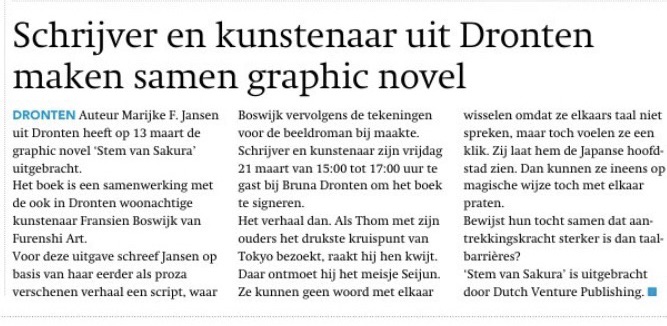 De novelle Stem van Sakura is vanaf 10 juni 2023 verkrijgbaar in alle mogelijke vormen; als e-book (ook via Kobo Plus) en als audiobook via de bekende kanalen (het audiobook zelfs via Spotify) en bij de auteur als hardcover. En inmiddels dus ook als graphic novel; prachtig getekend door Fransien Boswijk.